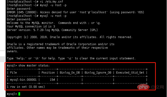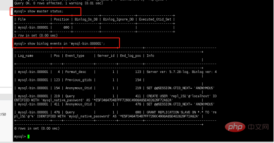 到这里我们主库就配置完成了;可以使用show master status来查看binlog日志是否发生了变化。也可以使用show binlog events in ‘mysql-bin.000001’;来查看刚刚我们所作的操作。