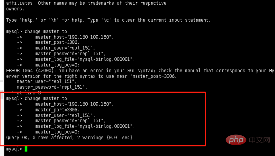change master to master_host="192.168.189.150", master_port=3306, master_user="repl_151", master_password="repl_151", master_log_file="mysql-bin.000001", master_log_pos=0;